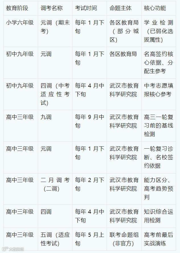 武汉调考体系覆盖小学六年级(小升初衔接)、初中九年级(中考备考)与高中三年级(高考备考)三个核心阶段,非毕业年级(如初一、初二、高一、高二)严禁组织区域性或跨校际调考,仅可组织校内期末考试。各阶段调考的设置如下: