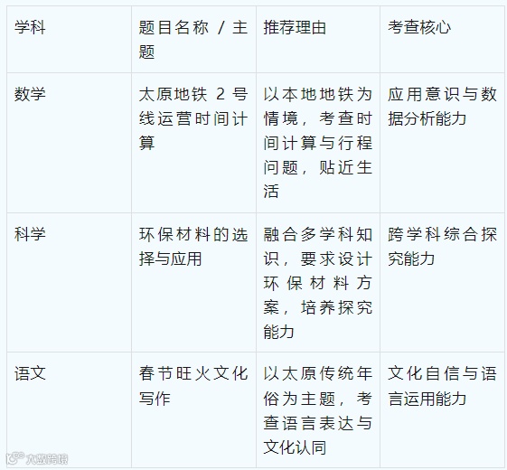 虽然目前公开题例中直接关联太原专属文化符号的试题较少,但已有明确线索显示命题的在地性导向:自媒体报道提及,太原卷中出现了 “表里山河晋善晋美” 的语文写作题、“临汾小西天游客数量统计” 的数学题,间接关联山西文旅资源;太原教研院的命题培训明确要求 “结合本地生活情境改编试题”,例如尖草坪区第七实验小学的数学命题就以 “太原地铁 2 号线的运营时间” 为情境设计行程问题。这些设计的核心,是引导学生关注本地文化与社会发展。