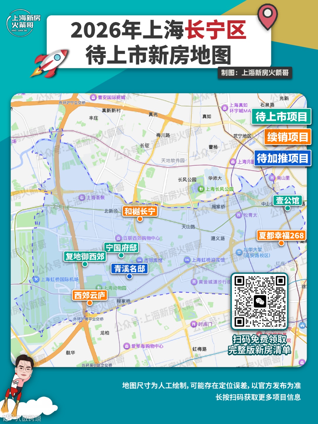 2026年,长宁区还有约7个新房项目,单价约11.5-20+万/㎡,总价覆盖800万-亿元级,完整楼盘地图如下。