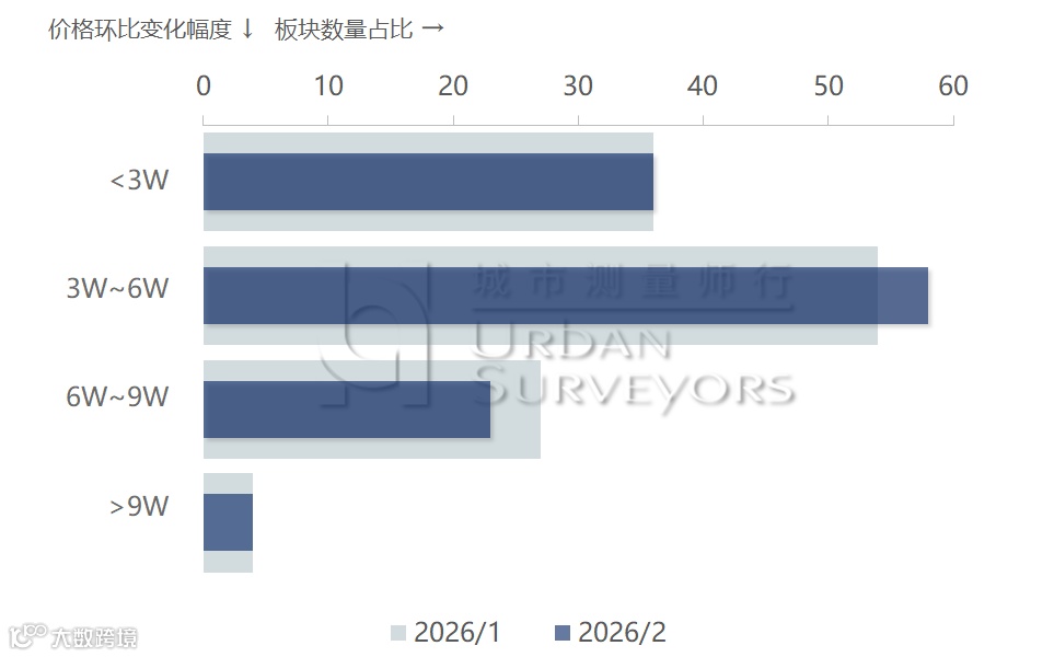 从均价变化来看,全市121个板块中,均价低于3万元/平方米的板块数量与上月持平;均价在3万元/平方米至6万元/平方米区间的板块数量持续增加,占比已接近六成;而均价高于6万元/平方米的板块数量较上月有所减少,其中均价在9万元/平方米以上的板块数量与上月相比持平。