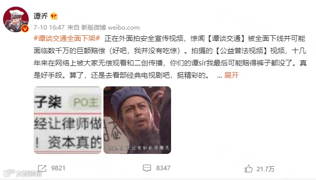不知奋战在亚马逊Prime Day的各位卖家朋友看热搜了没有?《谭谈交通》涉及知产侵权,遭全网下架,该栏目主持人或面临牢狱之灾和数千万赔偿。众网友都在声讨“碰瓷公司”并@罗翔老师出山,但谭Sir能否维权成功暂未可知,毕竟: