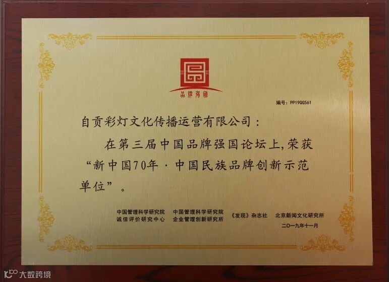 公司先后获得全国年度“十大活动策划机构”“自贡市2018年产业转型升级先进集体”“建国70周年·70家品牌主办机构金手指奖”“新中国70年·中国民族品牌创新示范单位”“ 四川省“金熊猫”先进集体称号,四川‘拼经济 搞建设’标兵”,是AAA级信用企业和自贡彩灯行业协会会长单位, 是国家对外文化贸易基地(自贡)和国家文化产业示范基地运营主体,中国文化产业协会会员单位。