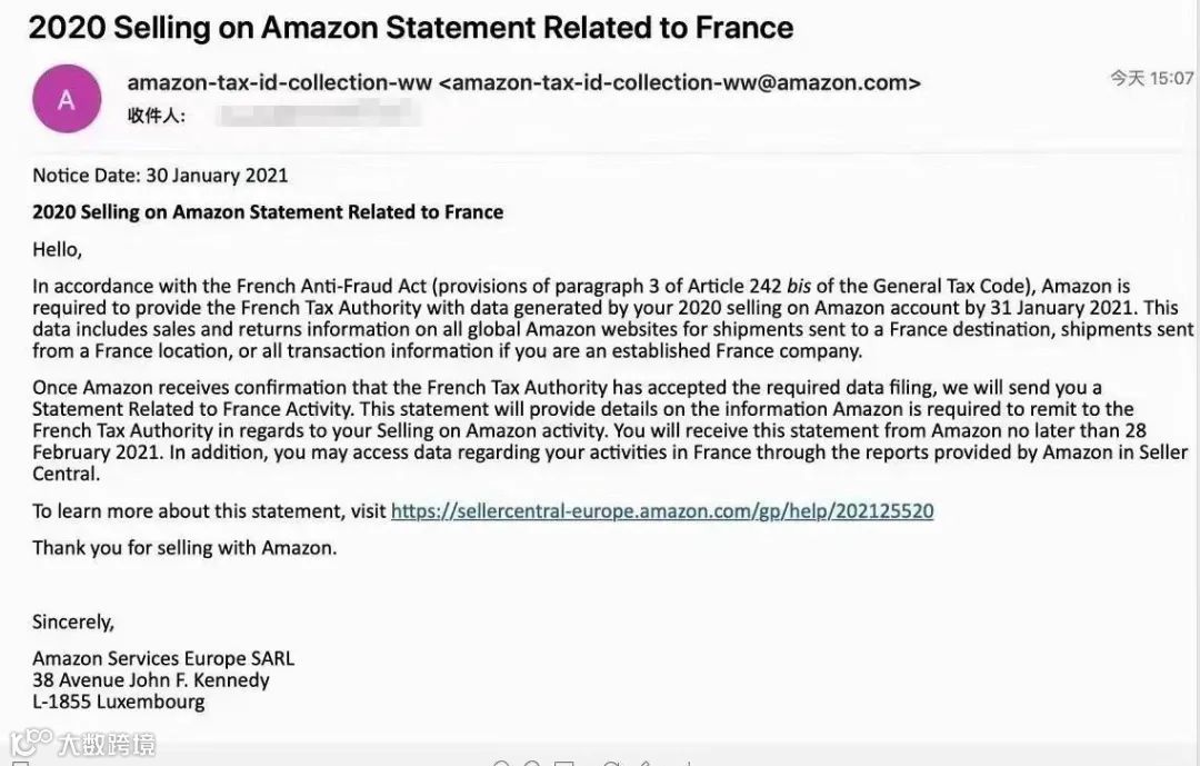 最近,不少法国站卖家反馈,收到了平台方要将法国站2020年销售数据发给法国税务局的邮件,没有一点防备,心态在崩溃边缘~