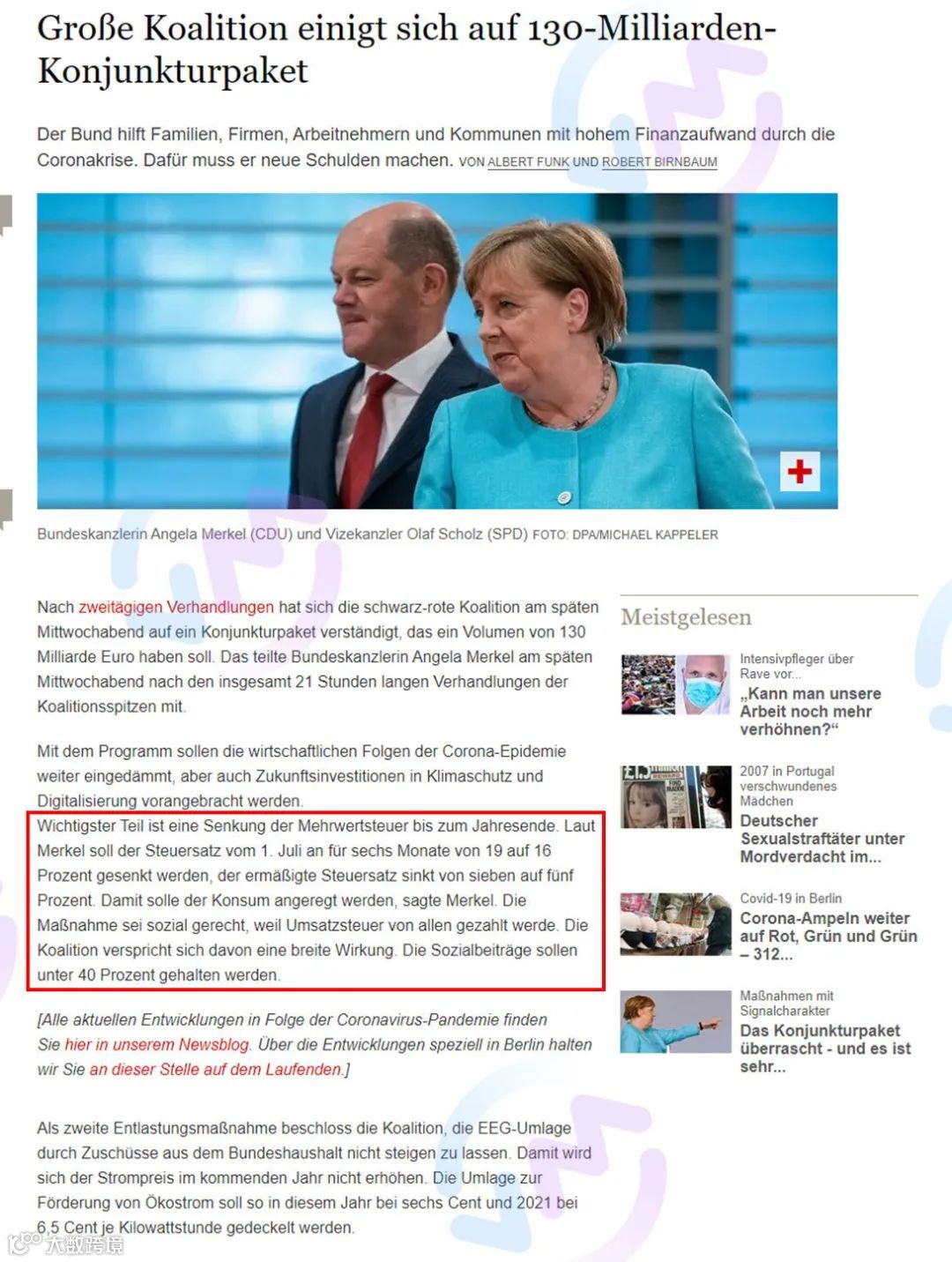 经过谈判,执政联盟基督教民主与社会联盟(CDU / CSU)和德国社会民主党(SPD)达成了一致。重点是降低消费税,从7月1日开始,增值税从19%下调至16%,低税率增值税从7%下调至5%,持续6个月。这部分减税预计总计200亿欧元。