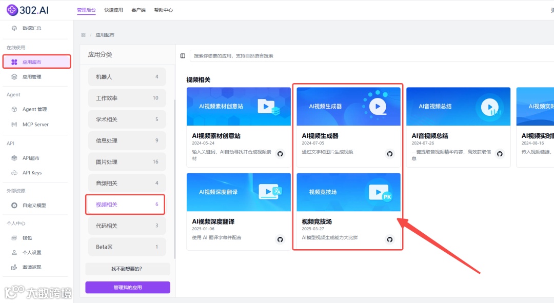 应用超市:AI 视频竞技场、视频生成器 API超市:支持在线调试 |