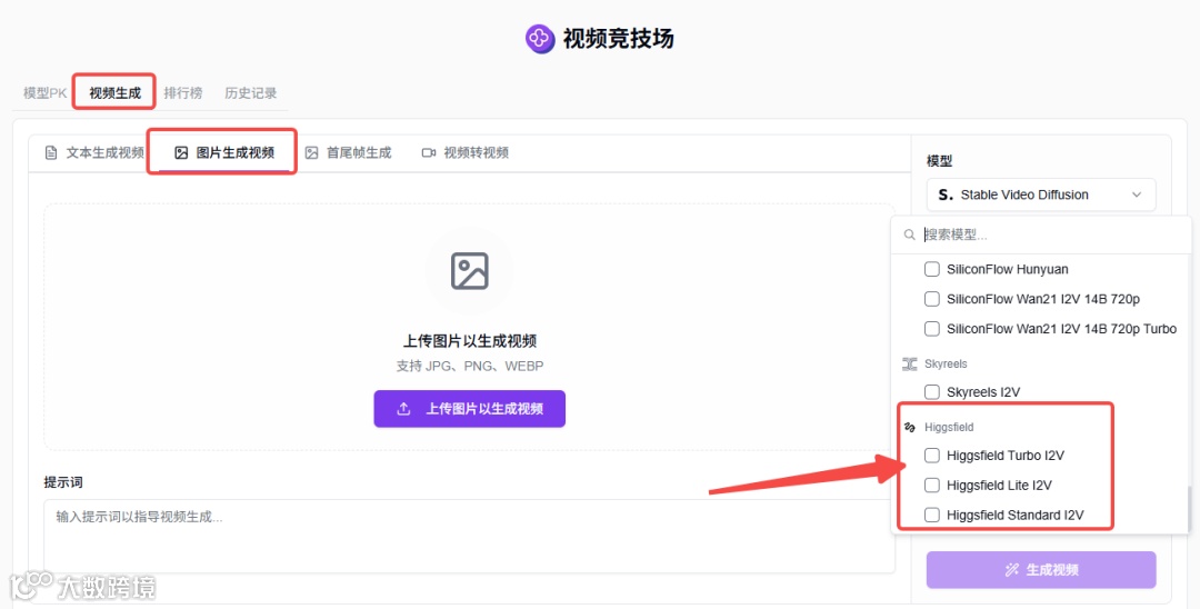 视频竞技场→视频生成→图片生成视频→勾选模型。