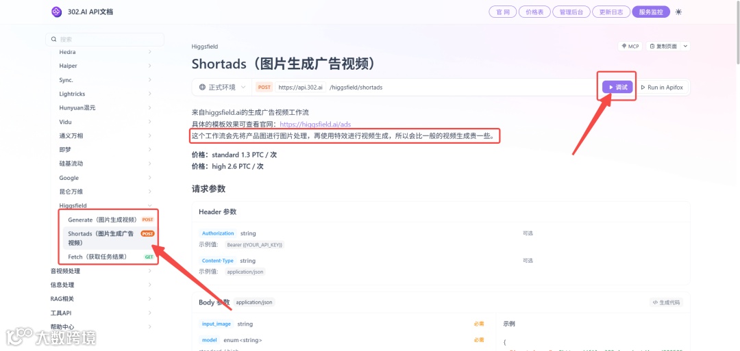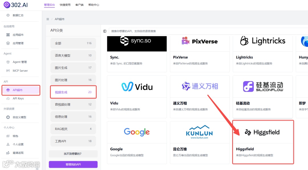 操作指引:API超市→ 视频生成 → Higgsfield→相关文档;