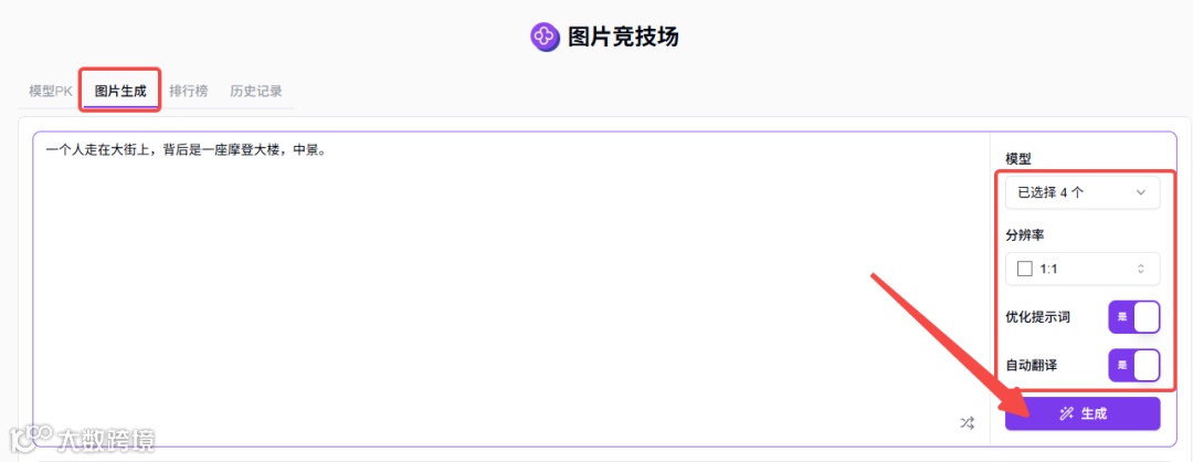 (2)进入图片竞技场后点击图片生成,简单描述想要生成的图片,打开优化提示词和自动翻译功能,帮助用户更准确生成优质图片。(可勾选多个模型同时生成)