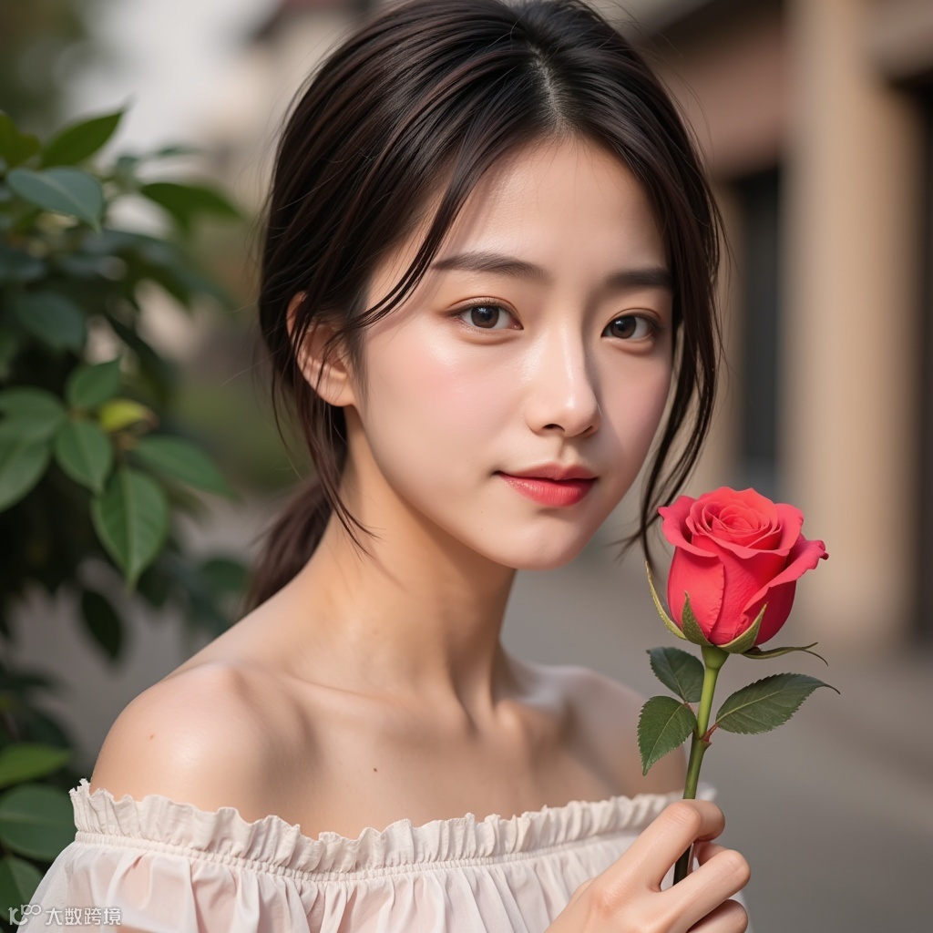 (提示词:女孩拿着花的手轻轻晃动,嘴角微微笑着)