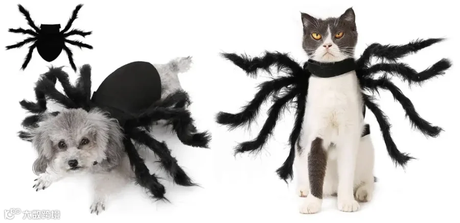 蜘蛛服装如此受欢迎,不难理解。首先,蜘蛛元素就是万圣节最经典的元素之一,契合万圣节氛围,对大多数人来说是不必费心也不会出错的安全牌;其次,从造型设计来看,这款蜘蛛胸背对宠物的束缚度较小,仅在颈部和胸腹处使用魔术帖绑带来固定,可调整松紧度,能满足养宠家长要避免引起宠物不适的需求,且猫、狗通用;材质方面,由透气、轻量的毛毡制成,重量仅109克,基本不会对宠物的行动造成负担。