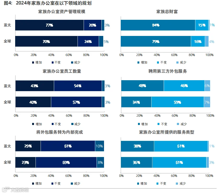 数据表明,其中77%的家族办公室预计他们的资产管理规模(AUM)将在2024年持续增长,84%预计家族财富会增加。鉴于这些增长前景,超过四成的家族办公室计划今年扩招(43%),拓展服务类型(38%),并进一步使用第三方外包服务(48%)。