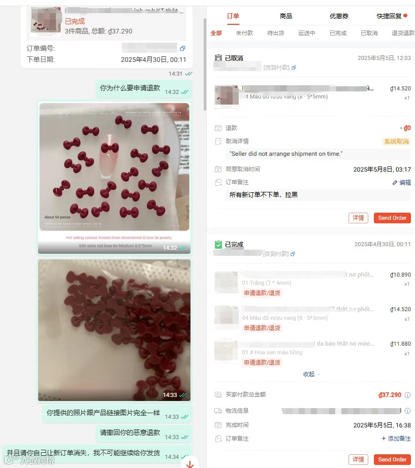 据张先生描述,该买家多次使用部分产品照片,以"缺货"为由申请退款,在客服沟通时拒绝回应却持续重复下单。