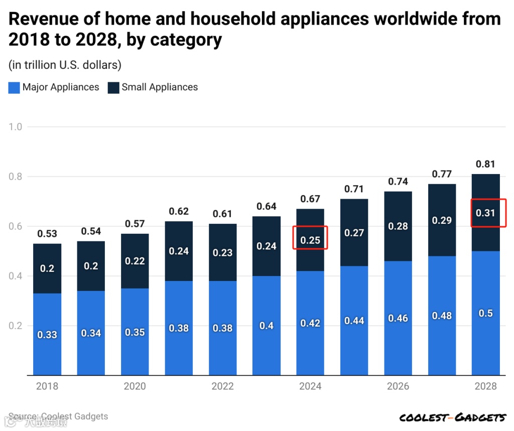 据Statista的数据预测,2024年全球小家电市场规模将达到2543亿美元。预计到2024年到2028年间,市场将保持4.65%的年复合增长率,达到3100亿美元。