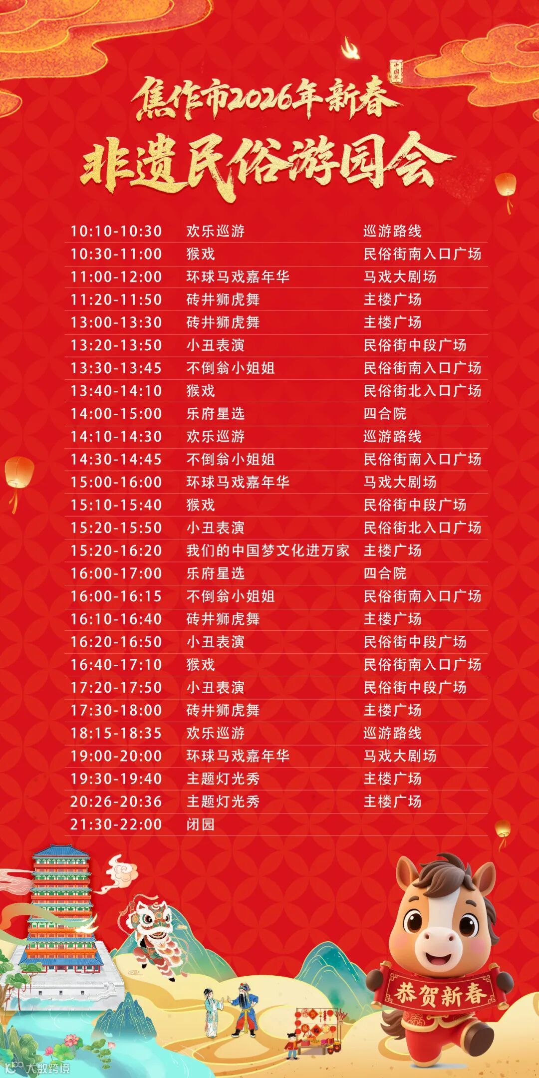 金驹送福,年味渐浓!2026年正月初一至十五,焦作新春非遗民俗游园会与马戏嘉年华双园齐开。这份超全活动指南,结合全域导览图,帮你轻松搞定入园、停车、游玩全流程,让你和家人安心畅玩,尽享新春欢乐!