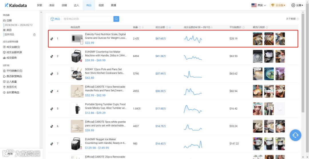根据Kalodata数据显示,某品牌智能营养秤自上架Tik Tok小店以来,销售额一直在不断增长。截至目前总销量已达5.54万件,总销售额约为163.87万美元。抓住小家电细分领域,做差异化出海,这是成功的关键。