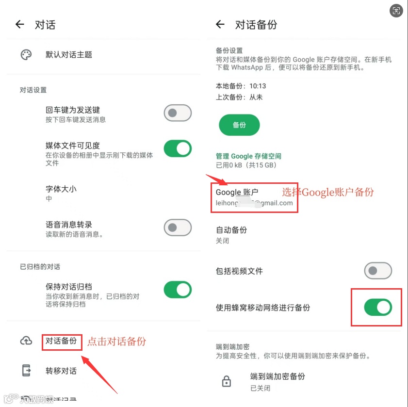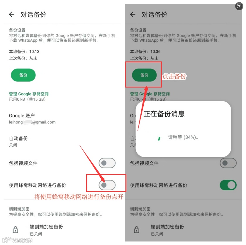 将使用蜂窝移动网络进行备份点开,点开是绿色的,然后点击备份就会开始备份我们的聊天记录,将聊天记录储存到谷歌账户的云端里面。只要谷歌账户有空间,就可以保留我们的WhatsApp聊天记录,下次要恢复就直接恢复就可以了。