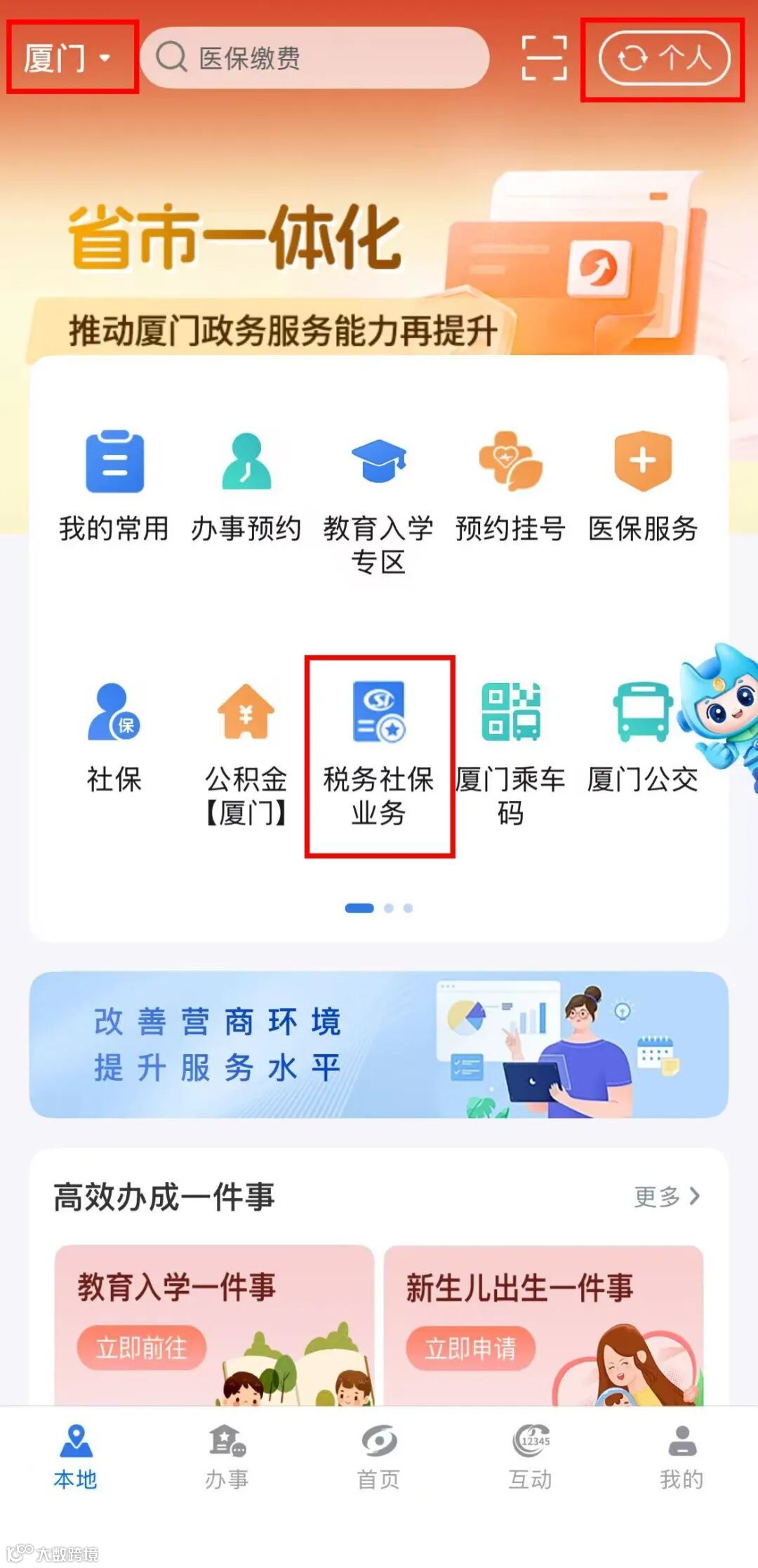 在“本地”中确认屏幕右上方为个人业务,在左上方定位为“厦门”,再通过【税务社保业务】进入社保专题。