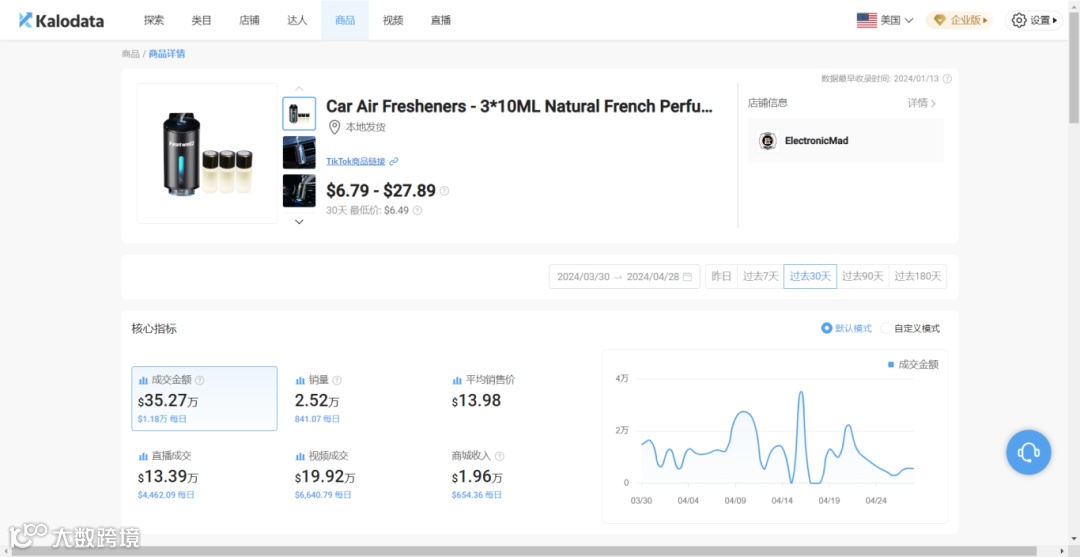 近日,TikTok一款智能车载香薰表现出强劲的增长势头。具备智能启动、自动关闭、智能调香等功能。不仅能做车载香薰,还能做时尚装饰配件。在TikTok Shop上平均售价为13.98美金,近1个月日均出货量超841单,销售额超35万美金。商品评分为4.6分,用户对其香气和性价比评价极高。