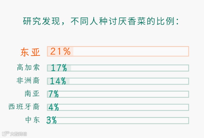 研究发现,东亚每五个人就有一个不爱吃香菜。这是因为香菜的“香气”由各种醛类物质组成,但肥皂气味、臭虫臭味里也带同样的醛类。而有的人体内11号染色体上,一个叫“OR6A2”的基因变异了,嗅觉系统会把醛类物质,全部判断为难闻的肥皂/臭虫味儿。大脑接收到嗅觉系统传来的强烈判断,就会让这个人讨厌香菜。