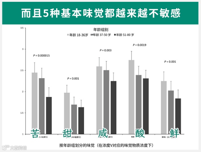 随着年龄的增长,你味蕾的更新能力会变差,唾液分泌也会跟着减少,而唾液本来是帮助溶解食物里的味道分子,促进味道分子跟味蕾结合传递味道的。而多项研究发现,“重口”很多时候就表现在吃得咸上,专业术语叫“味觉补偿”。