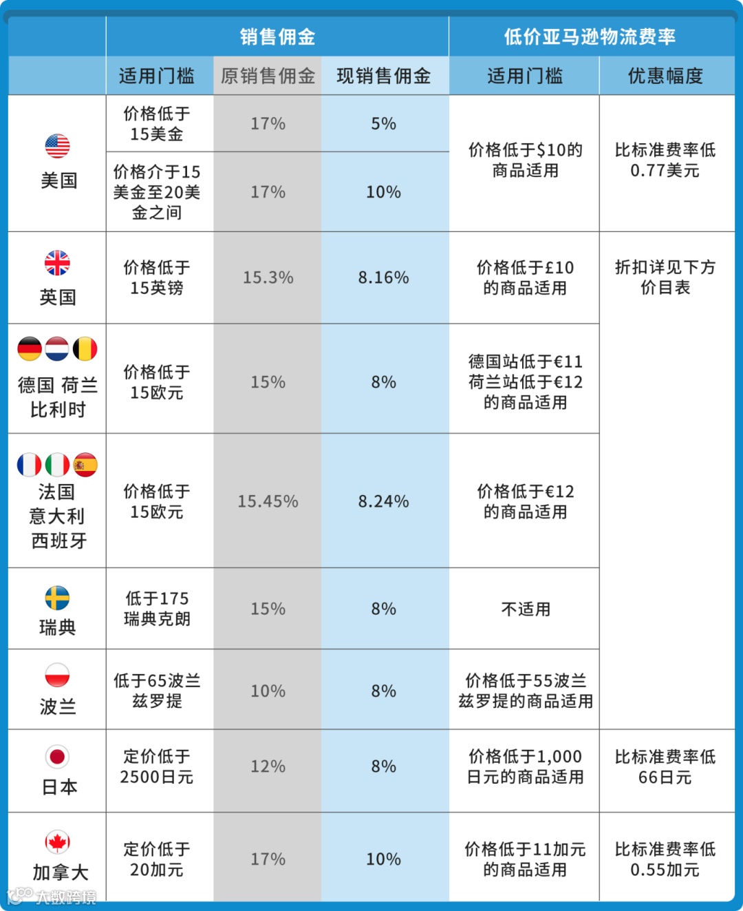 具体亚马逊佣金下调多少?有哪些站点在此次下调?根据官方给出的列表—亚马逊多站点下调服装类折扣销售佣金: