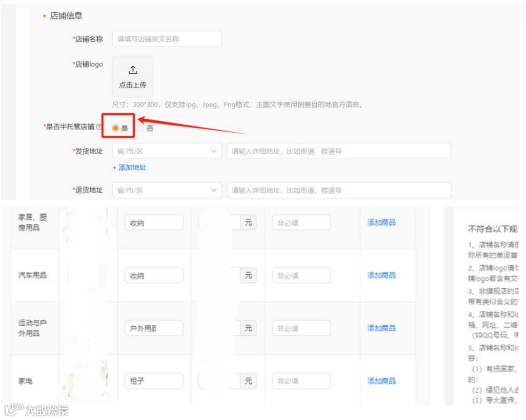 4、在填写信息时,选择是否半托管店铺,选择【是】,店诵经营概况中预计售卖商品栏中请优先上传市场爆品、图片质量高的商品、价格需具备优势,计划类目至少选择一个主营类目;