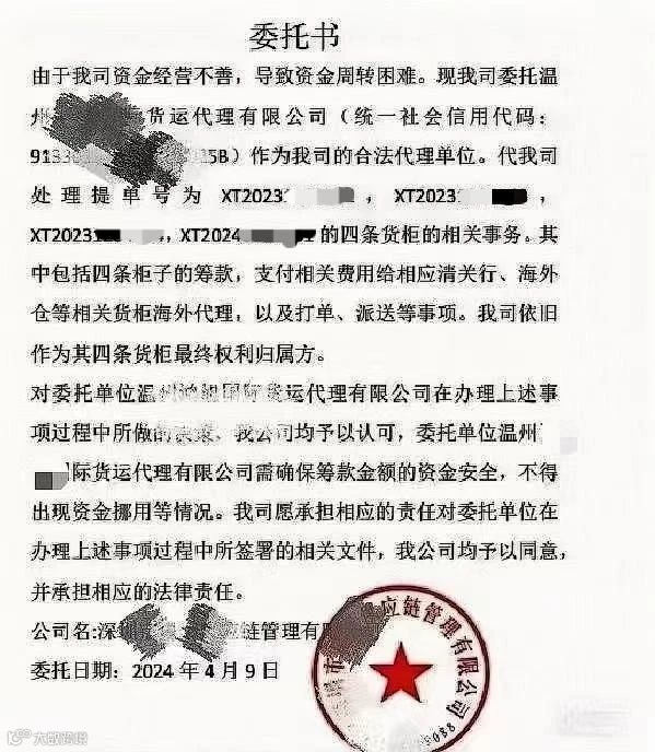 货代公司暴雷屡见不鲜,无非是资金链断裂导致。这家深圳货代亦是如此,委托书表明经营不善,资金周转困难为由,委托温州某一货代公司代理处理相关事务。