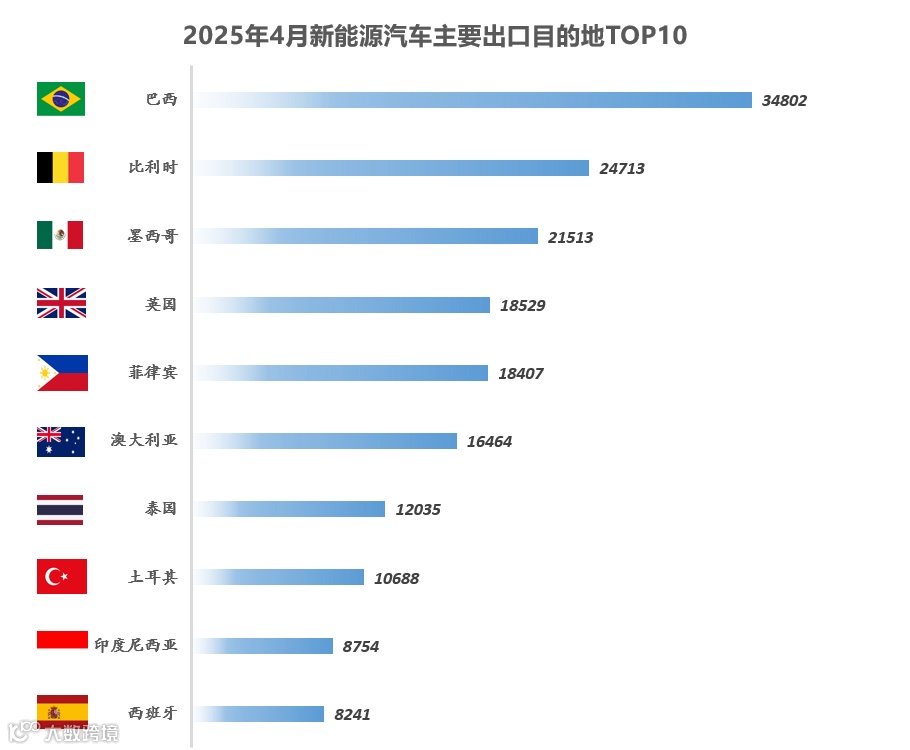 2025年4月新能源车出口前十大目的国 : 巴西(34,802辆)、比利时(24,713辆)、墨西哥(21,513辆)、英国(18,529辆)、菲律宾(18,407辆)、澳大利亚(16,464辆)、泰国(12,035辆)、土耳其(10,688辆)、印度尼西亚(8,754辆)和西班牙(8,241辆)。