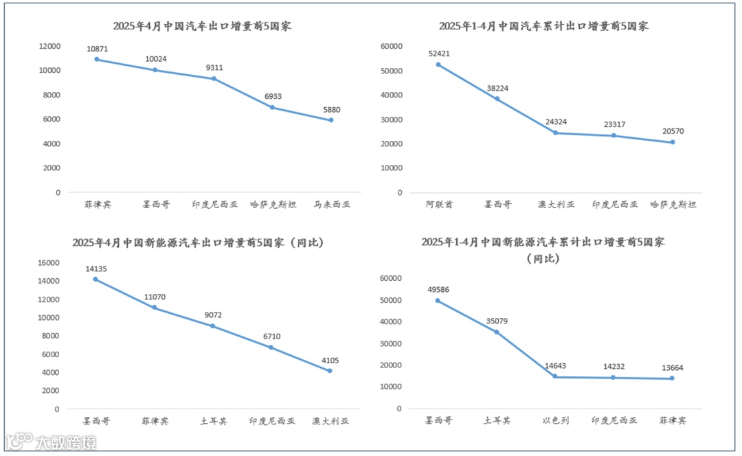 2025年4月中国汽车整车出口前十国家:墨西哥(49,139辆)、巴西(41,404辆)、俄罗斯(32,406辆)、阿联酋(31,146辆)、澳大利亚(29,965辆)、英国(26,421辆)、比利时(25,636辆)、菲律宾(23,672辆)、沙特阿拉伯(23,084辆)和马来西亚(18,237辆)。