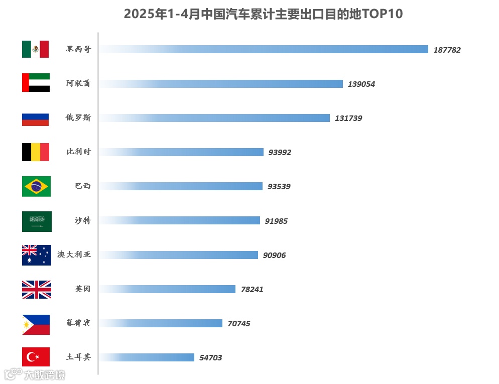 2025年1-4月中国汽车整车出口总量前十国家:墨西哥以187,782辆位居榜首,紧随其后的是阿联酋(139,054辆)、俄罗斯(131,739辆)、比利时(93,992辆)、巴西(93,539辆)、沙特阿拉伯(91,985辆)、澳大利亚(90,906辆)、英国(78,241辆)、菲律宾(70,745辆)和土耳其(54,703辆)。