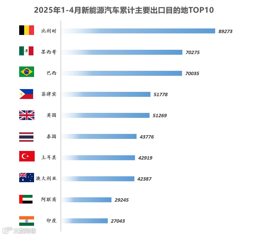 2025年1-4月新能源车累计出口前十国家 : 比利时以89,273辆领先,随后为墨西哥(70,275辆)、巴西(70,035辆)、菲律宾(51,778辆)、英国(51,269辆)、泰国(43,776辆)、土耳其(42,919辆)、澳大利亚(42,387辆)、阿联酋(29,245辆)和印度(27,043辆)。