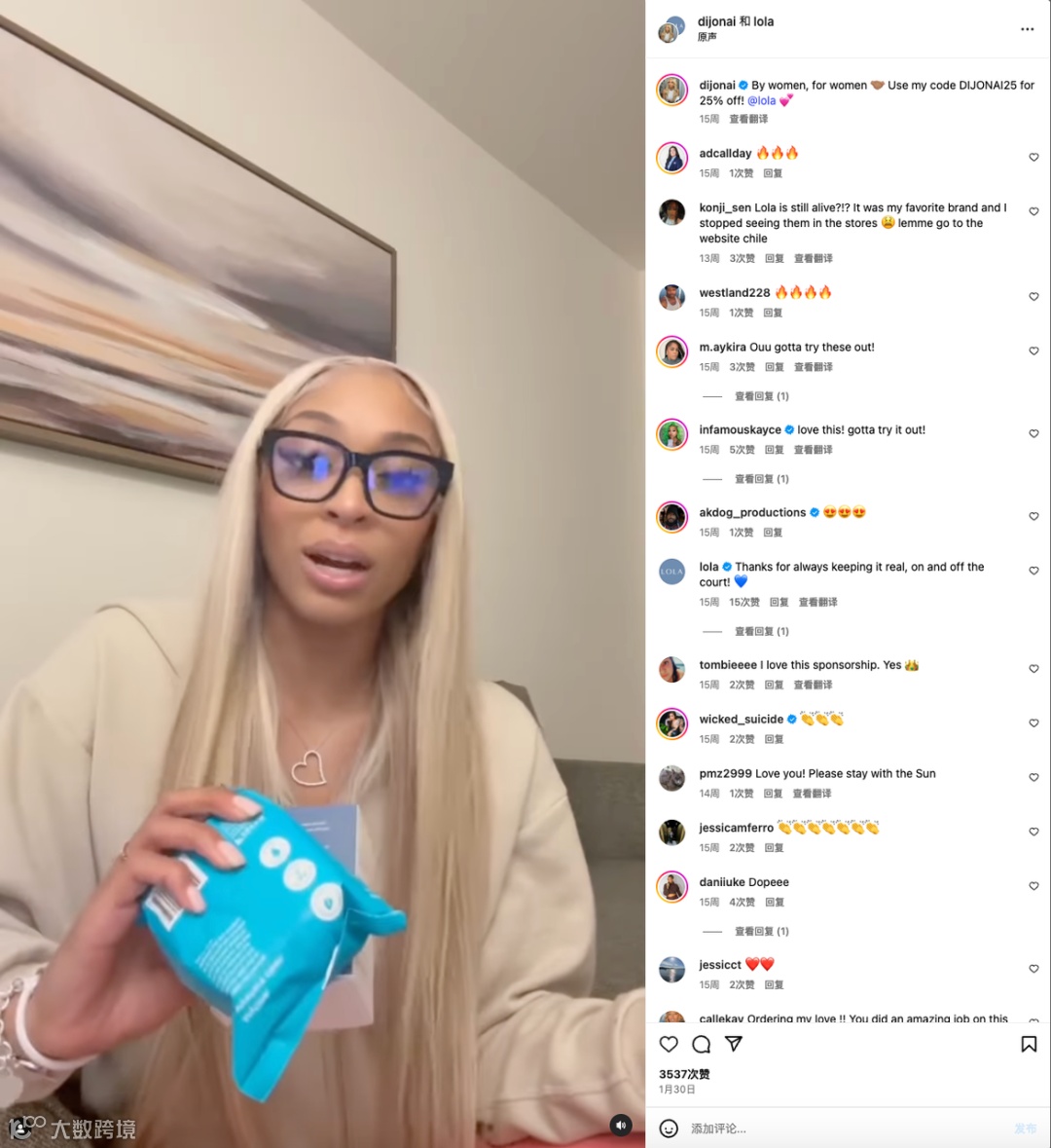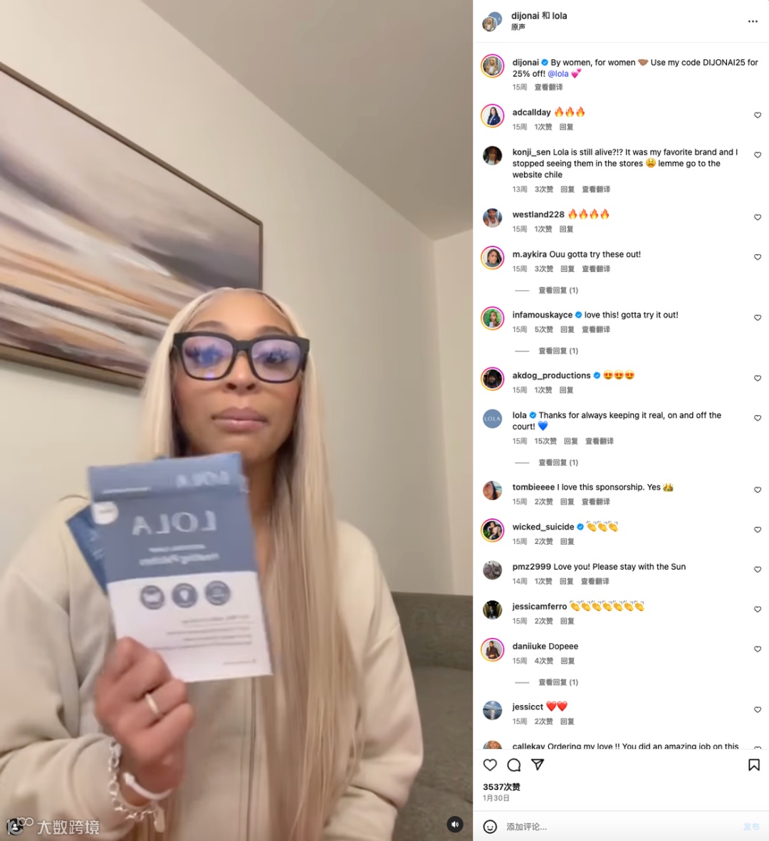 本次合作以 Instagram Reels 形式呈现,标题“By women, for women”,呼应 Lola 女性生活场景需求。Reel 中 DiJonai 展示了 Lola 产品包装与实物,结合自身生活场景进行使用演示,并自然融入专属折扣码“DIJONAI25”。