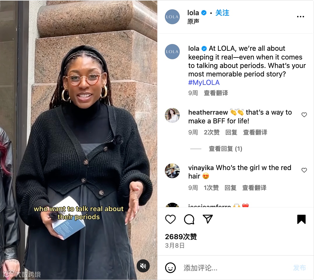 Lola经常在向用户发起发起话题标签(如 #MyLOLA),邀请用户分享真实的月经体验或护理心得,营造“我们同在”的社区氛围。