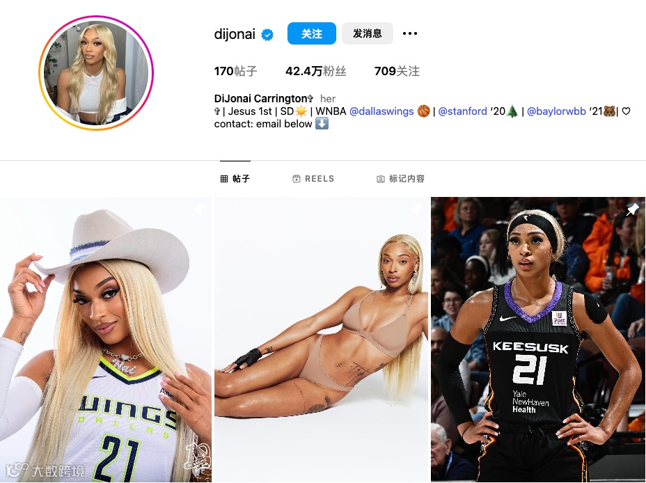 DiJonai Carrington,是一名篮球运动员,效力于WNBA联盟的Dallas Wings。因为身份属性,她拥有“健康、自信、运动美”的人物标签,配合个人简介中强调的信仰与正向价值观,吸引了42万的粉丝关注,属于非常优质且与Lola “女性力量”与“天然健康”的品牌调性高度契合的社媒红人。