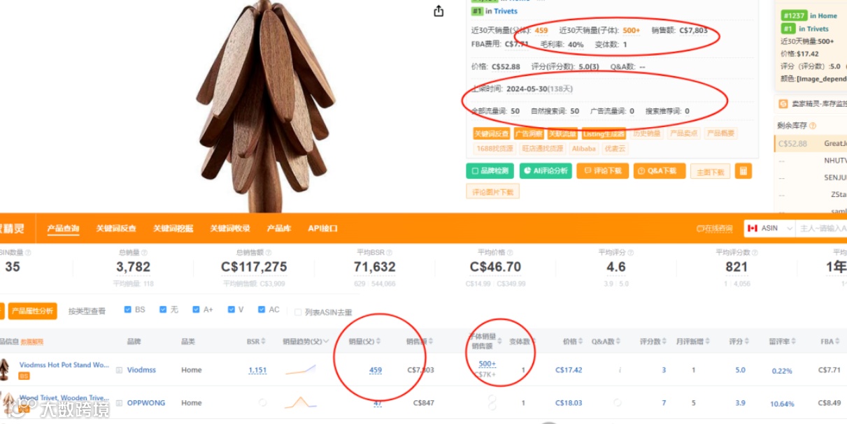 单量:在卖家精灵中显示上架时间是2024年05年30号,目前为止持续销售138天,30天销售量父体(459),子体销量(500+)