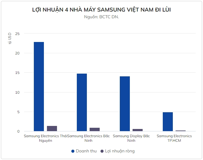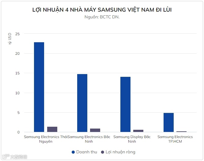 其中,越南太原三星电子(SEVT)作为三星全球最大的智能手机工厂,收入增长 7% 至 229 亿美元,利润却下降 7% 至 14 亿美元;北宁的三星电子(SEV)收入增长 6% 达 148 亿美元,利润下降 10% 至 9 亿美元,三星显示器(SDV)销售额下降 16% 至 141 亿美元,利润下降 25% 至 6 亿美元;胡志明市的三星电子 CE 综合体(SEHC)销售额增长 14% 至 49 亿美元,然而利润降幅最大,下降 40% 至 2 亿美元 ,成为越南利润率最低的单位。