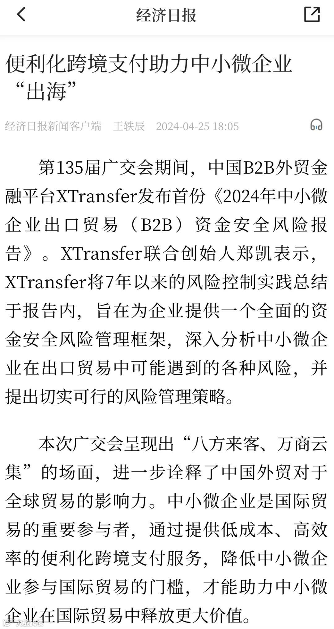 第135届广交会期间,XTransfer发布首份《2024年中小微企业出口贸易(B2B)资金安全风险报告》,助力中小微企业便利出海,《经济日报》报道点赞!
