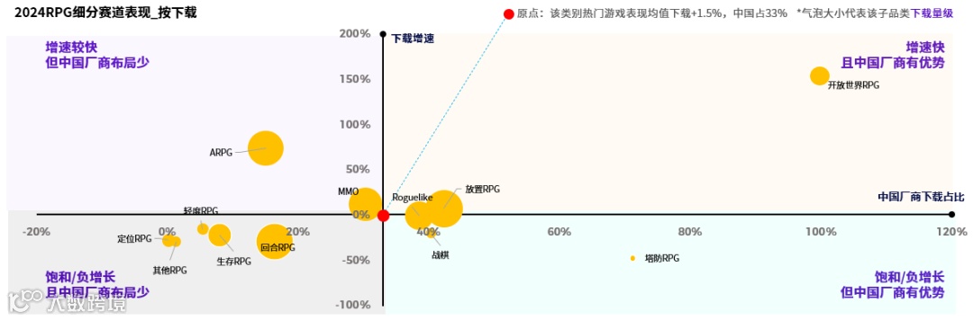 放置RPG表现突出,开放世界增长最快。2024年收入增长最高的三个品类为放置RPG、ARPG与Roguelike RPG。开放世界RPG以154%的增速遥遥领先,中国厂商在此领域占据主导地位。