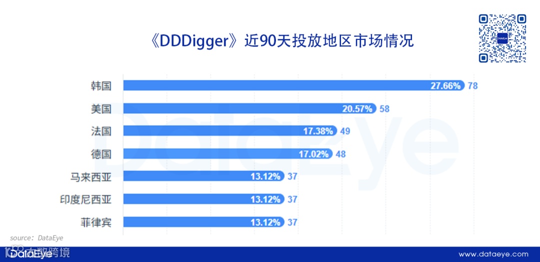 DataEye-ADX海外版数据显示,《DDDigger》在3至4月素材投放量显著增加,但目前有所回落。游戏主要面向韩国、美国等头部市场进行投放。