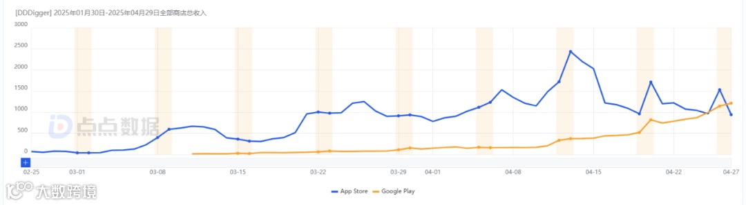 截至4月30日,《DDDigger》双端预估收入为50.2万元人民币,其中iOS占比79.88%,谷歌占20.12%。安卓端收入呈现超过iOS的趋势。