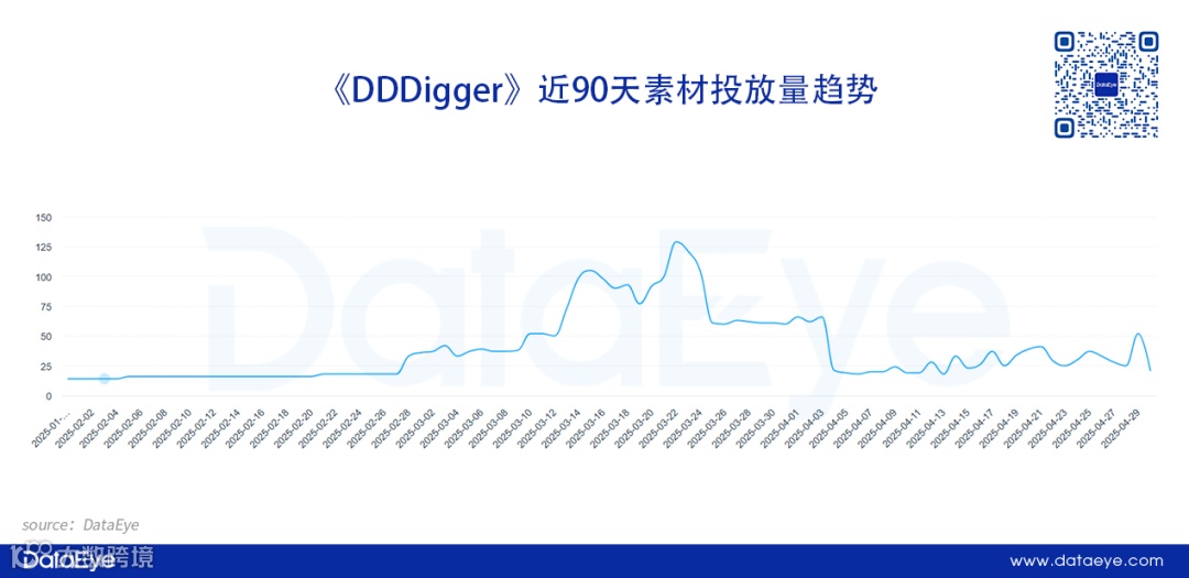 《DDDigger》自2025年1月开启测试素材投放,2月底正式上线后素材量激增,3月日均投放超过100条。进入4月后投放力度明显下降。