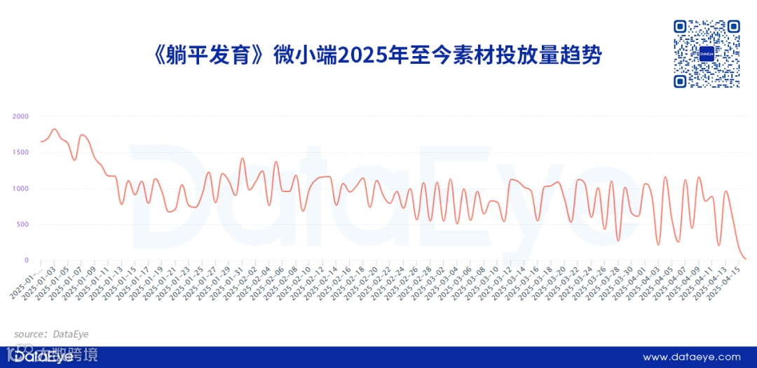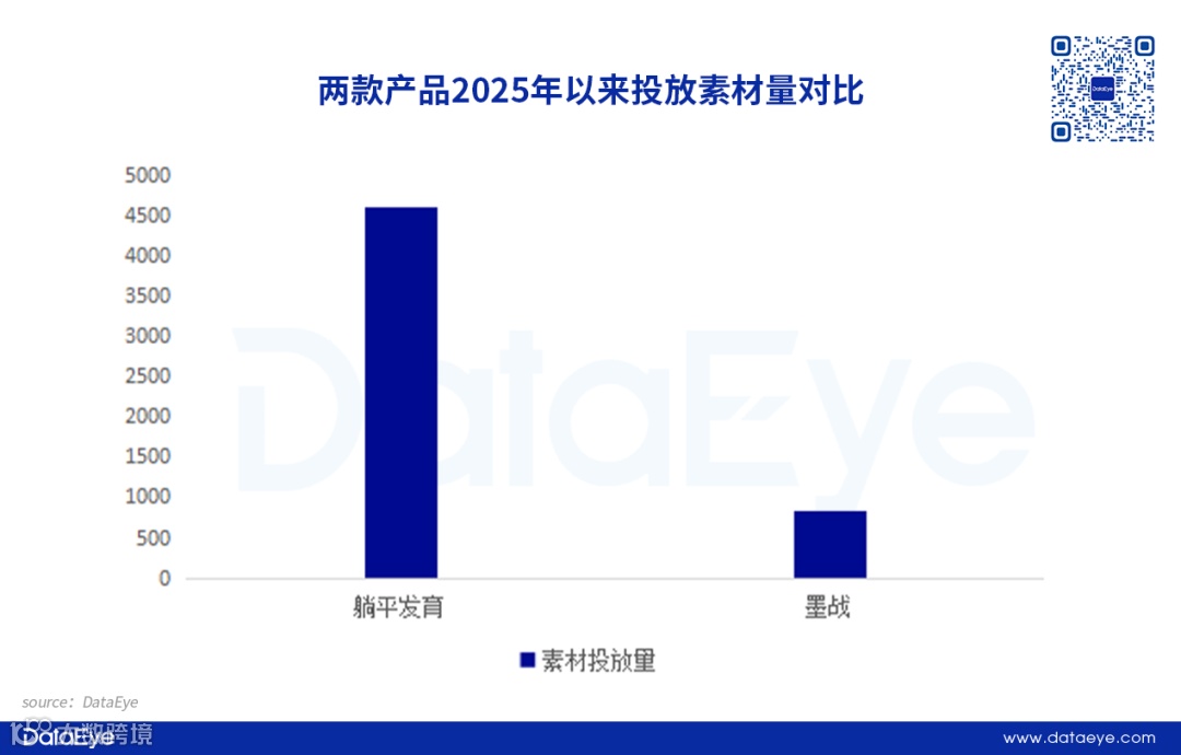 相比之下,《躺平发育》同期素材投放量超过4600条,是《墨战》的5倍多。但从趋势来看,《躺平发育》的投放强度已呈现下降趋势。