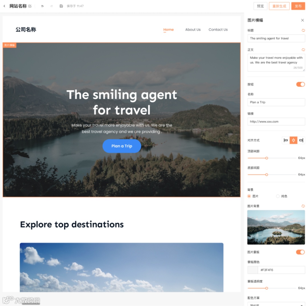 你可以对生成的网站进一步做调整,不满意可以AI一键生成新的图片,网站的布局、内容、标题和文案等都可以进行自由修改。