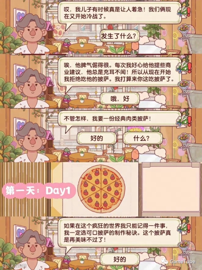 🌸第一天 Day 1(游戏日第一天):需要为大胡子妈妈制作一个经典肉类披萨,配方为蕃茄酱➕芝士➕辣肠➕猪肉粒(切6块)。