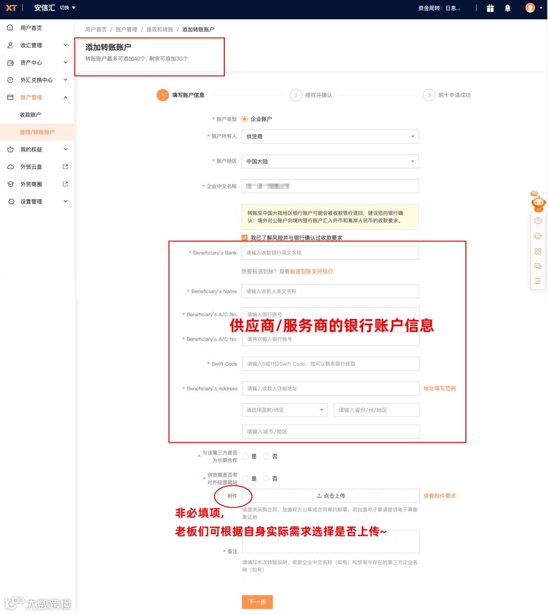 外贸企业使用XTransfer转账功能时,转账绑卡仅提供供应商/服务商的银行账户信息即可。
