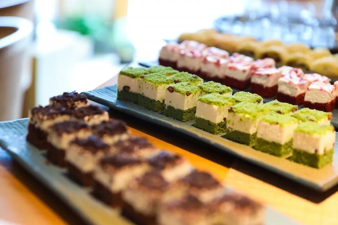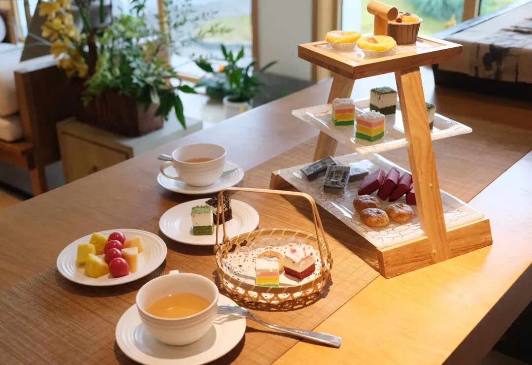 各式各样的甜品、鲜切水果、现沏的茶水……
