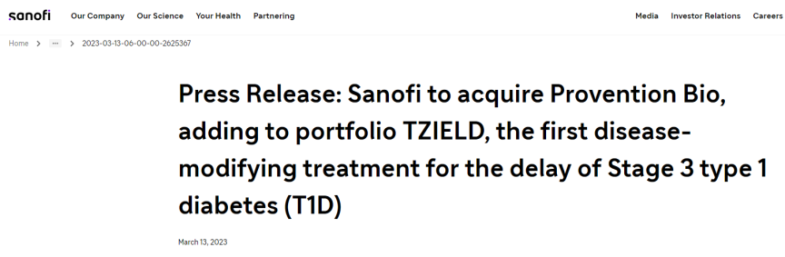 2023年3月13日,赛诺菲(Sanofi)和Provention Bio联合宣布,两者达成协议,赛诺菲将斥资近29亿美元收购Provention,并囊获用于延缓1型糖尿病(T1D)发病的药物Teplizumab。本次交易为赛诺菲产品管线中增添了一款first-in-class的T1D疗法。赛诺菲表示将继续拓展其在糖尿病领域的能力,最大限度地发挥Teplizumab作为变革性疗法的潜力。