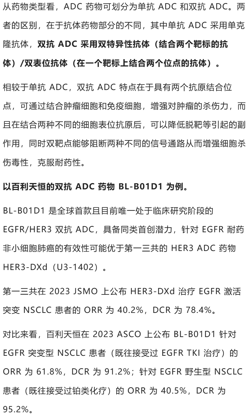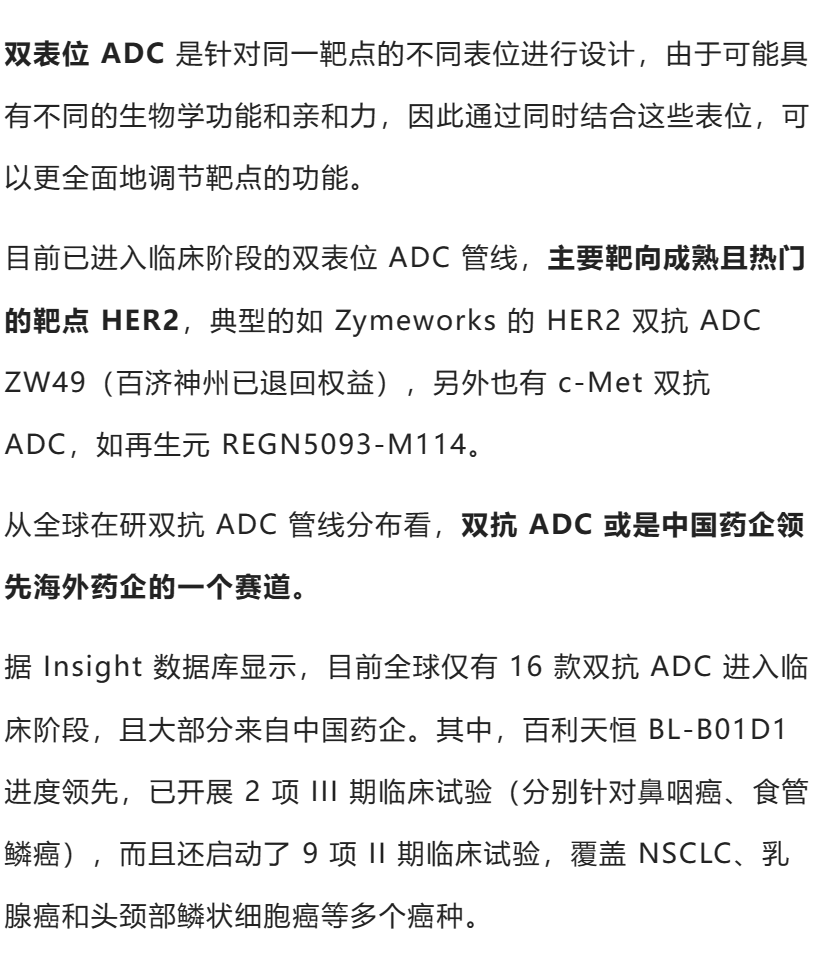 如前文所述,双抗 ADC 是在抗体药物部分采用双特异性抗体/双表位抗体,由此可划分为双表位 ADC 和双靶点 ADC(双特异性 ADC)两种药物类型。