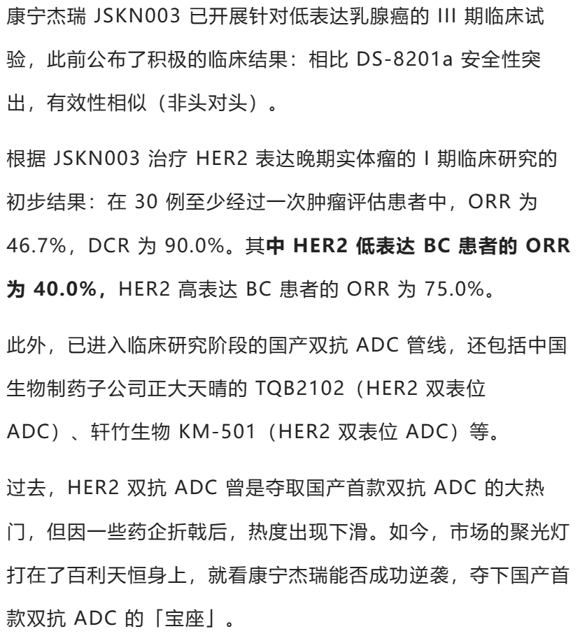 作为先行者的百利天恒、康宁杰瑞,正在努力争夺首款双抗 ADC 的「宝座」,翰森制药、中国生物制药等也抢滩布局。