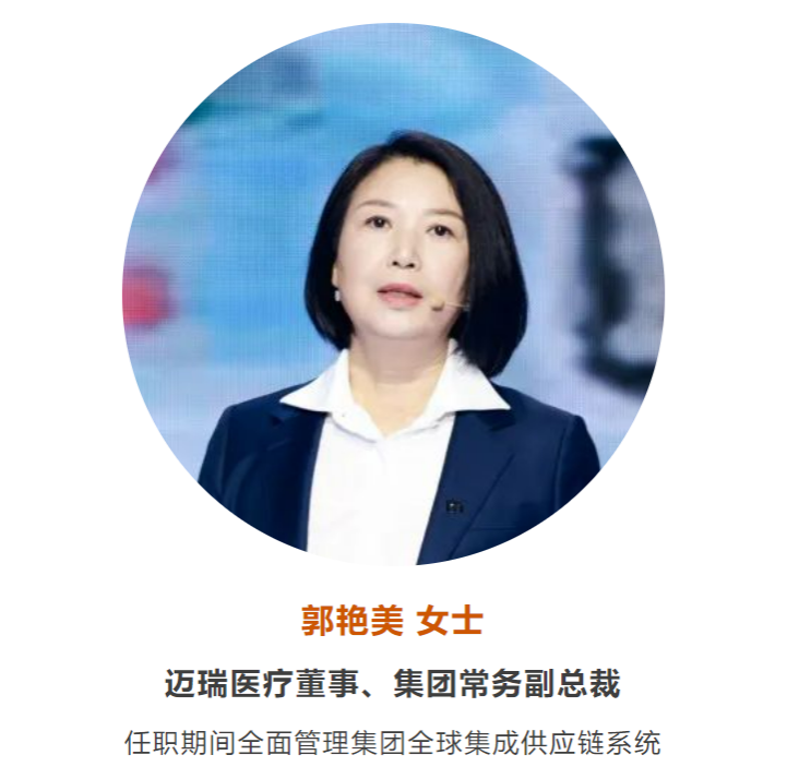 本届大会的轮值主席由郭艳美女士担任。郭艳美女士在迈瑞集团任职期间全面管理集团全球集成供应链系统、集团质量体系、AEO 体系和安全与环境体系、集团 IT 中心和行政中心,以及集团采购管理委员会、数据管理委员会和 ESG 可持续发展委员会等综合管理工作。